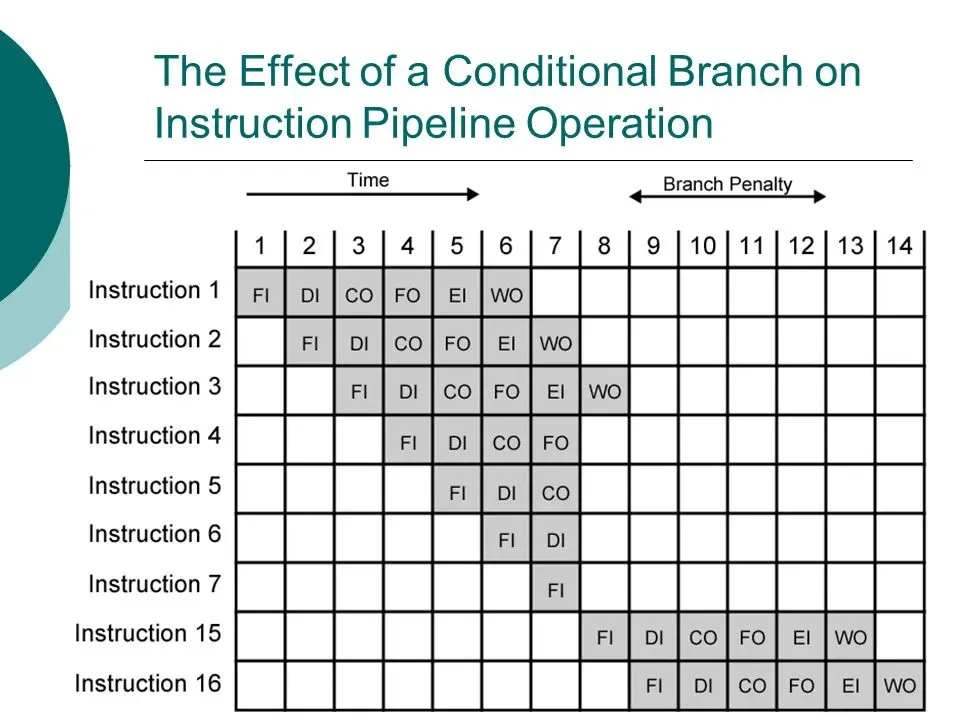 Como um terceiro desdito na vida dos pipelines e com um destaque por ser o pior contratempo temos as instruções com salto condicional. O que fazer quando uma das instruções enfileiradas é de salto condicional? O problema é claro: pode ser que todas as instruções enfileiradas atrás do salto condicional se tornem incorretas, pois o salto acontece e leva o programa para outro lugar de memória. Nesse caso, o que ocorre? Bem, ocorre que precisamos jogar fora toda a fila. A imagem abaixo exemplifica esse tipo de atraso.