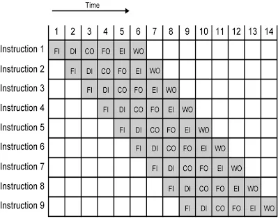 A imagem abaixo mostra o cenário ideal, onde 9 instruções são enfileiradas ao mesmo tempo; cada uma em uma etapa diferente de execução.