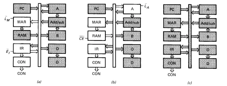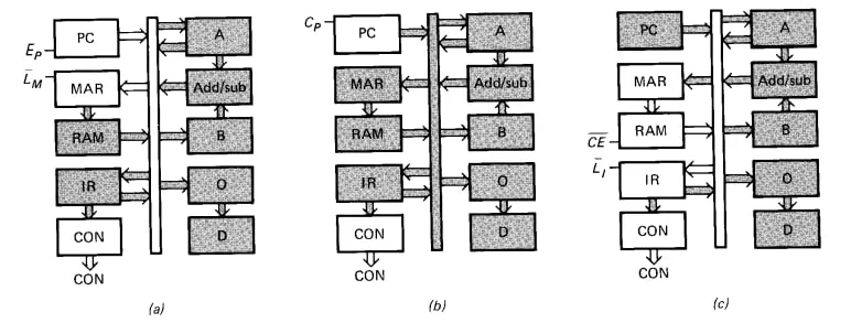 - Ep - Sinal de enable do PC. Assim como todos os outros registradores do SAP I, o PC utiliza drivers de alta impedância para controlar o fluxo de dados para o W bus. Quando Ep está em HIGH, o valor em PC é carregado no W bus.