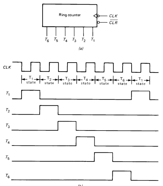 Section titled “3. Ciclo de Fetch”Uma das coisas que ainda não vimos é como exatamente é possível implementar os ciclos propostos por von Neumann. O SAP I apresenta a solução para este problema de forma particularmente didática. O segredo por trás da implementação dos ciclos do SAP I é a utilização de um Ring Counter para definir seis estados distintos para a unidade de controle. A figura 14.05 exibe o ring counter do SAP I e a carta de tempos dos seus estados.