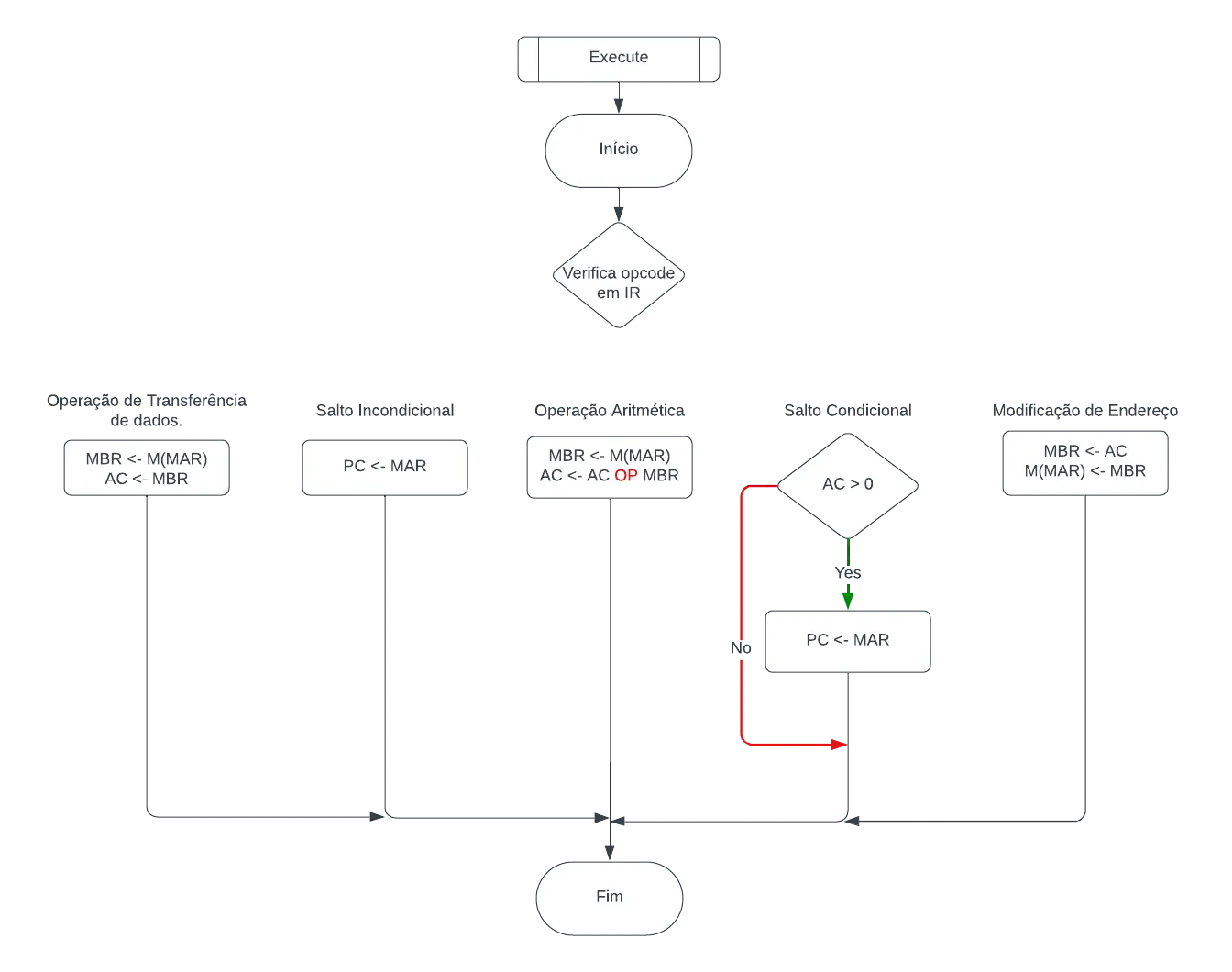 - Operações de saltos condicionais - mesma coisa que os saltos incondicionais, mas dessa vez o salto é feito (ou não) baseando-se no valor do registrador AC. É o esqueleto de uma estrutura condicional.