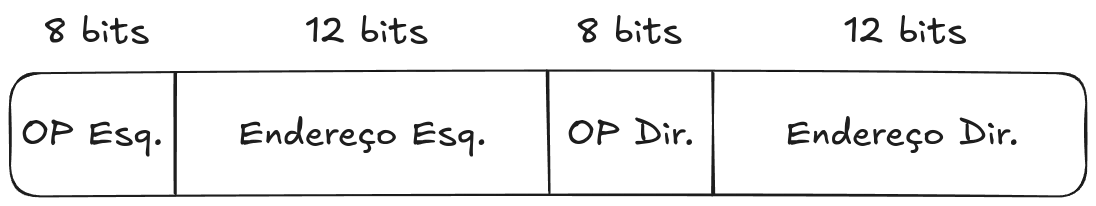 A palavra de instrução é dividida em duas partes: a instrução da esquerda e a instrução da direita. Cada uma delas ocupa 20 bits. Para cada instrução, há a divisão de 8 bits para o opcode e os 12 bits restantes para um endereço de operando/nova instrução. A figura 12.05 representa esse tipo de palavra.