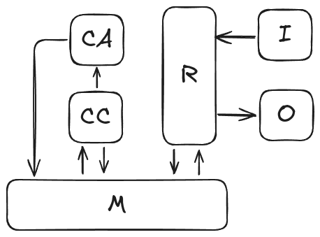 - Um computador deve ter uma interface para a entrada de dados (I). Essa entrada não deve ser encaminhada diretamente para o CC ou CA, mas sim passar por M.